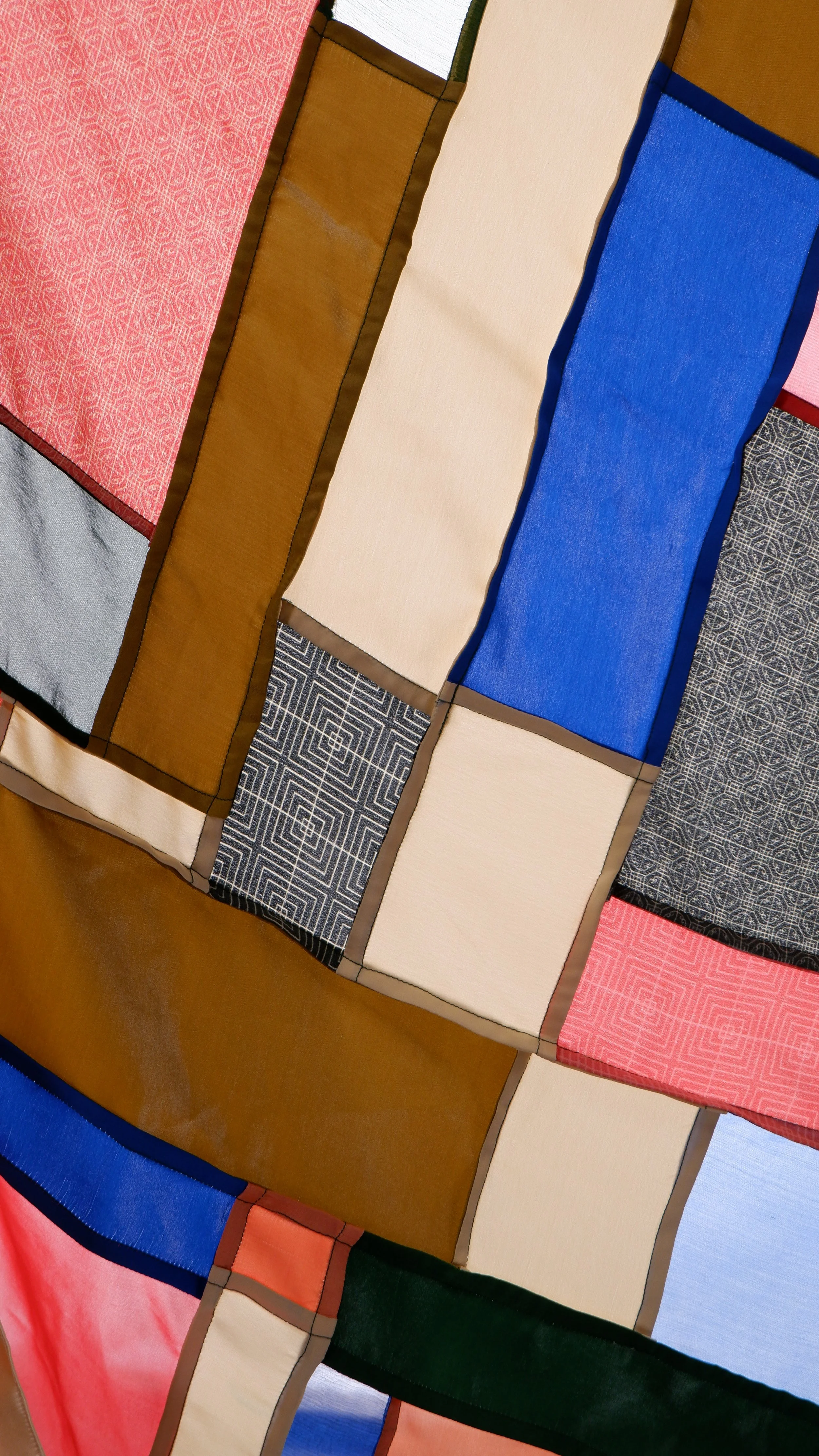 Crafted from re-dyed silk offcuts, this piece would not have been possible without the generosity of Law Design Studio, Derek Rose, Gingerlily, and De Gournay. Their kind donations of silk offcuts allowed me to transform what would have been waste into something meaningful and enduring.